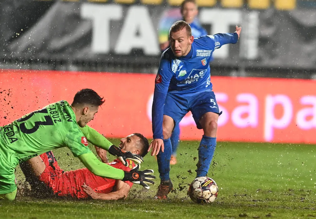 Catalin Vasile Cabuz, Razvan Constantin Oaida si Modestas Vorobjovas in meciul de fotbal dintre Chindia Targoviste si FCSB, contand pentru Superliga Superbet, desfasurat pe Stadionul Ilie Oana din Ploiesti, duminica 11 decembrie 2022. © FOTO:Razvan Pasarica/SPORT PICTURES