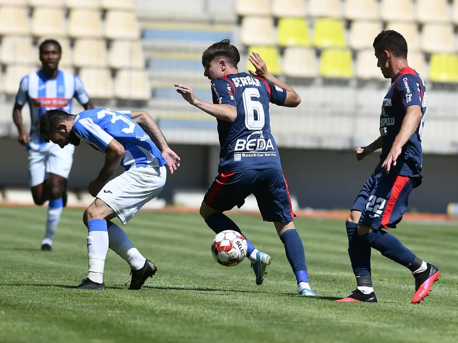 Ovidiu Horsia si Andrei Dragos Serban in meciul de fotbal dintre Chindia Targoviste si CSM Politehnica Iasi, contand pentru play-out-ul Ligii 1 Casa Pariurilor, disputat fara spectatori pe Stadionul Ilie Oana din Ploiesti, sambata 27 iunie 2020. © FOTO:Razvan Pasarica/SPORT PICTURES
