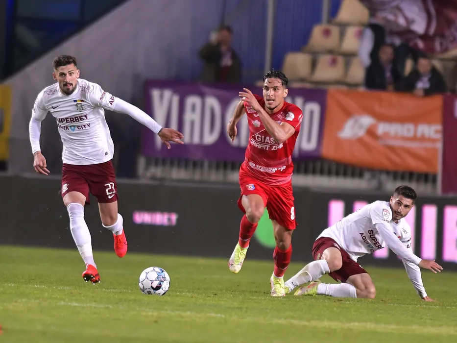 Alexandru Cristian Albu, Marco Alexandru Dulca si Romario Florin Moise in meciul de fotbal dintre Chindia Targoviste si Rapid Bucuresti, contand pentru Play-out-ul Ligii 1 Casa Pariurilor, desfasurat pe Stadionul Ilie Oana din Ploiesti, vineri 29 aprilie 2022. © FOTO:Razvan Pasarica/SPORT PICTURES