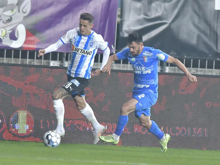 Alexandru George Cimpanu si Marius Madalin Martac in meciul de fotbal dintre Chindia Targoviste si Universitatea Craiova, contand pentru Liga 1 Casa Pariurilor, desfasurat pe Stadionul Ilie Oana din Ploiesti, vineri 22 octombrie 2021. © FOTO:Razvan Pasarica/SPORT PICTURES