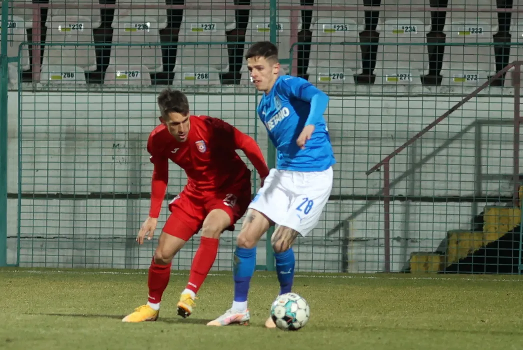 Milan Kocic (S), de la Chindia Targoviste lupta pentru balon cu George Cimpanu (D), de la Universitatea Craiova in meciul de fotbal din sferturile de finala ale Cupei Romaniei, disputat pe stadionul Gloria din Buzau, marti, 2 martie 2021. GEORGE FILIP / MEDIAFAX FOTO
