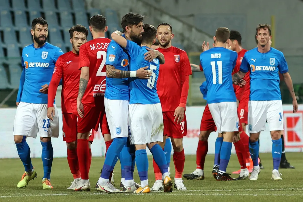 Paul Papp (CS) si Bogdan Vatajelu (CD), de la Universitatea Craiova, reactioneaza la finalul meciului de fotbal contra echipei Chindia Targoviste din sferturile de finala ale Cupei Romaniei, disputat pe stadionul Gloria din Buzau, marti, 2 martie 2021. GEORGE FILIP / MEDIAFAX FOTO