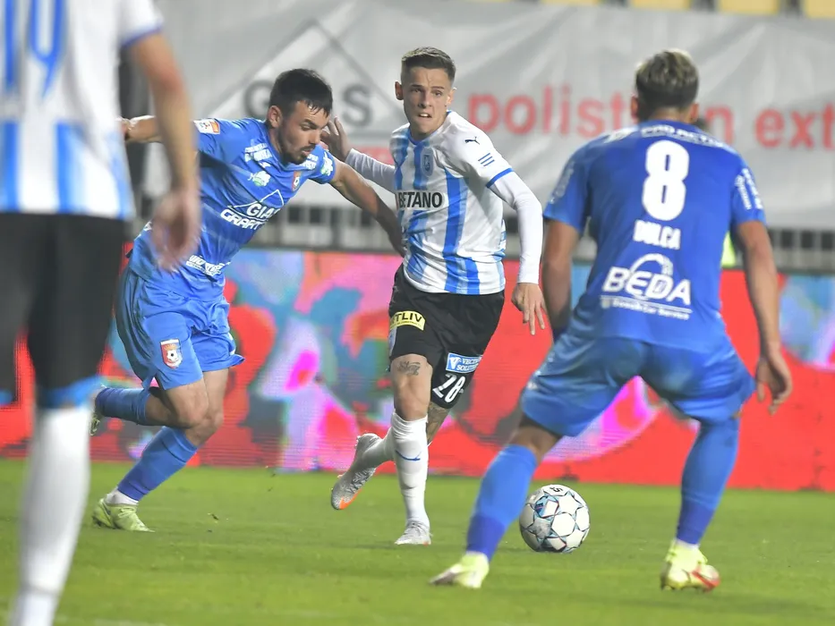 Marius Madalin Martac si Alexandru George Cimpanu in meciul de fotbal dintre Chindia Targoviste si Universitatea Craiova, contand pentru Liga 1 Casa Pariurilor, desfasurat pe Stadionul Ilie Oana din Ploiesti, vineri 22 octombrie 2021. © FOTO:Razvan Pasarica/SPORT PICTURES