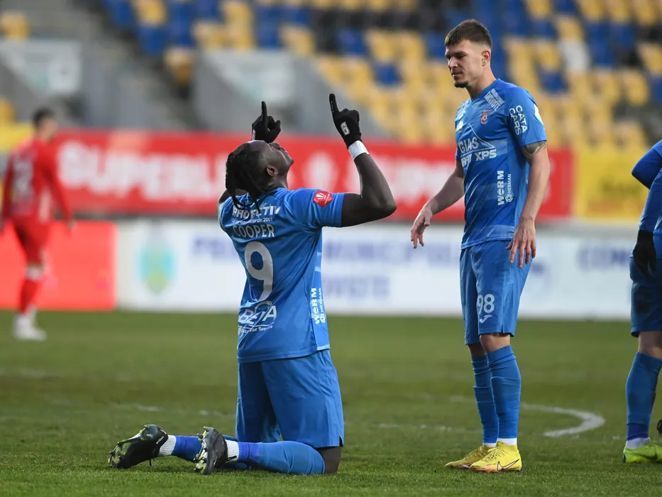 Godberg Barry Cooper multumeste Divinitatii dupa un gol marcat alaturi de Tiberiu Ionut Capusa in meciul de fotbal dintre Chindia Targoviste si UTA Arad, contand pentru Superliga Superbet, desfasurat pe Stadionul Ilie Oana din Ploiesti, vineri 3 februarie 2023. © FOTO:Razvan Pasarica/SPORT PICTURES