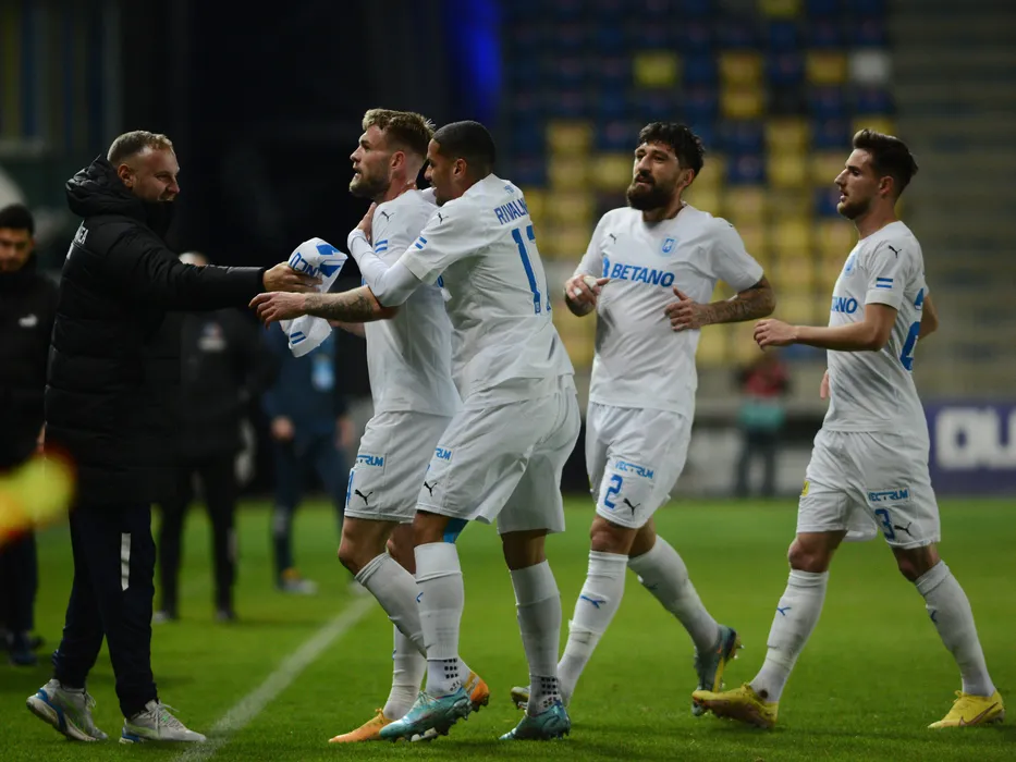 Alexandru Cretu se bucura dupa un gol marcat alaturi de Cristian Mihai Capatina, Paul Papp si Vitor Ferreira Mosac Rivaldo in meciul de fotbal dintre Chindia Targoviste si Universitatea Craiova, contand pentru Superliga Superbet, desfasurat pe Stadionul Ilie Oana din Ploiesti, marti 29 noiembrie 2022. © FOTO:Cristi Stavri/SPORT PICTURES