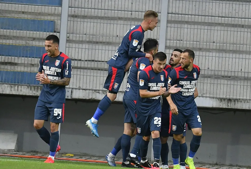 Bucurie a fotbalistilor de la Chindia cu Ovidiu Alexandru Bic, Vadim Rata si Cristian Daniel Negut in meciul de fotbal dintre Chindia Targoviste si FC Viitorul, contand pentru Liga 1 Casa Pariurilor, disputat fara spectatori pe Stadionul Ilie Oana din Ploiesti, miercuri 17 iunie 2020. © FOTO:Razvan Pasarica/SPORT PICTURES