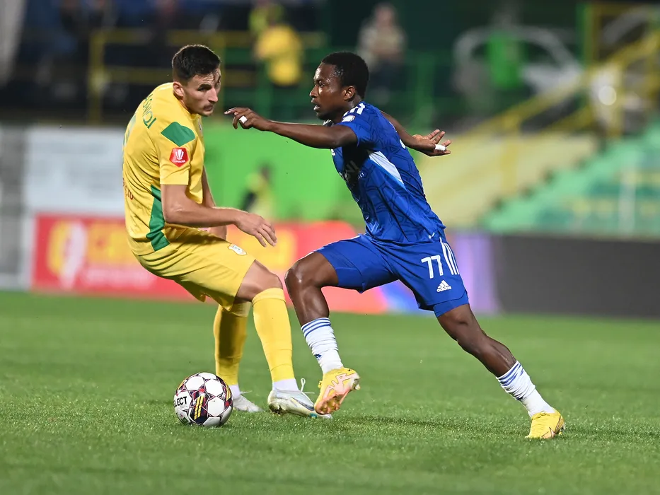 Blerim Krasniqi si Samuel Asamoah in meciul de fotbal dintre CS Mioveni si FC U Craiova, contand pentru Superliga Superbet, desfasurat pe Stadionul Orasenesc din Mioveni, sambata 1 octombrie 2022. © FOTO:Razvan Pasarica/SPORT PICTURES