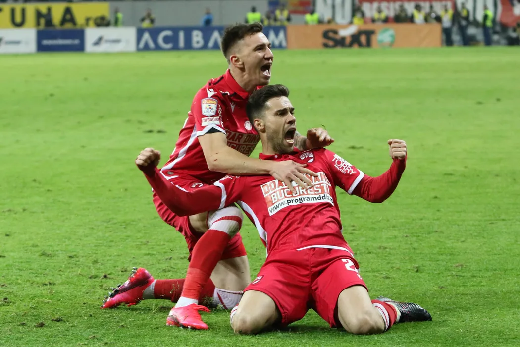 Andrei Sin (D), de la Dinamo Bucuresti, reactioneaza dupa inscrierea unui gol, in timpul meciului de fotbal contra echipei FCSBBucuresti, din etapa a XXV-a a Ligii 1, disputat pe Arena Nationala, duminica, 16 februarie 2020. GEORGE FILIP / MEDIAFAX FOTO
