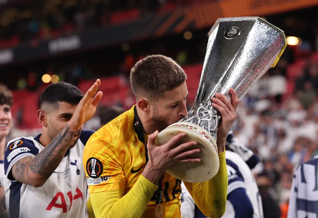 May 21, 2025, Bilbao: Bilbao, Spain, 21st May 2025. Guglielmo Vicario of Tottenham with the trophy after his team win during the Tottenham Hotspur vs Manchester United UEFA Europa League Final match at San Mames, Bilbao. (Credit Image: � David Klein/CSM via ZUMA Press Wire)