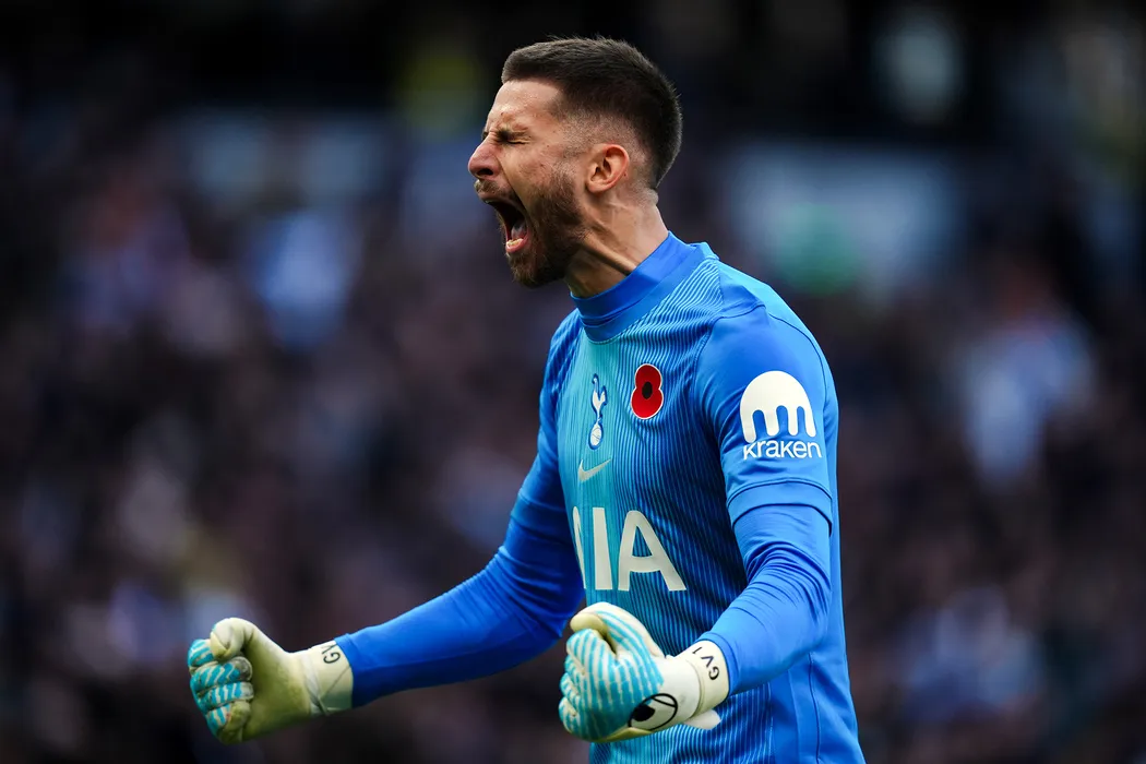 08 November 2025, United Kingdom, London: Tottenham Hotspur goalkeeper Guglielmo Vicario celebrates his sides second goal scored by Richarlison during the English Premier League soccer match between Tottenham Hotspur and Manchester United at Tottenham Hotspur Stadium. Photo: John Walton/PA Wire/dpa