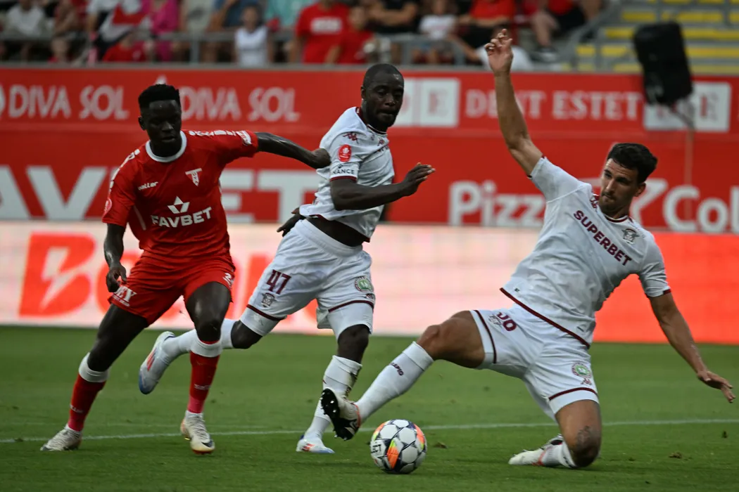 Filip Blazek, Christopher Braun și Eric Johana Omondi în meciul de fotbal dintre UTA Arad si FC Rapid 1923, contând pentru Superliga Superbet, desfășurat pe Arena Francisc Neuman din Arad, sâmbătă 13 iulie 2024. © FOTO: Leczki JOZSI/SPORT PICTURES