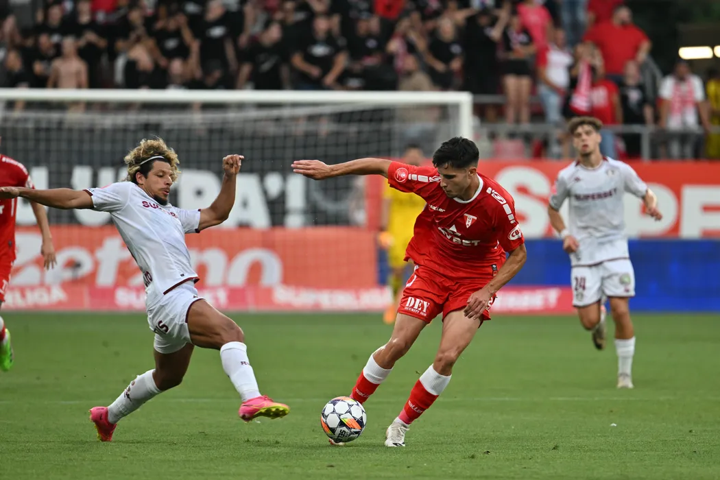 Valentin Raoul Cristea și Jayson Jordan Julien Romain Papeau în meciul de fotbal dintre UTA Arad si FC Rapid 1923, contând pentru Superliga Superbet, desfășurat pe Arena Francisc Neuman din Arad, sâmbătă 13 iulie 2024. © FOTO: Leczki JOZSI/SPORT PICTURES