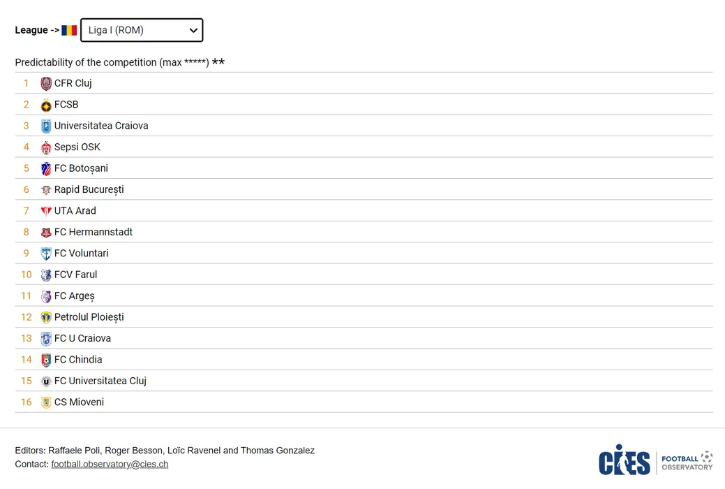 Clasamentul din Superliga făcut de CIES