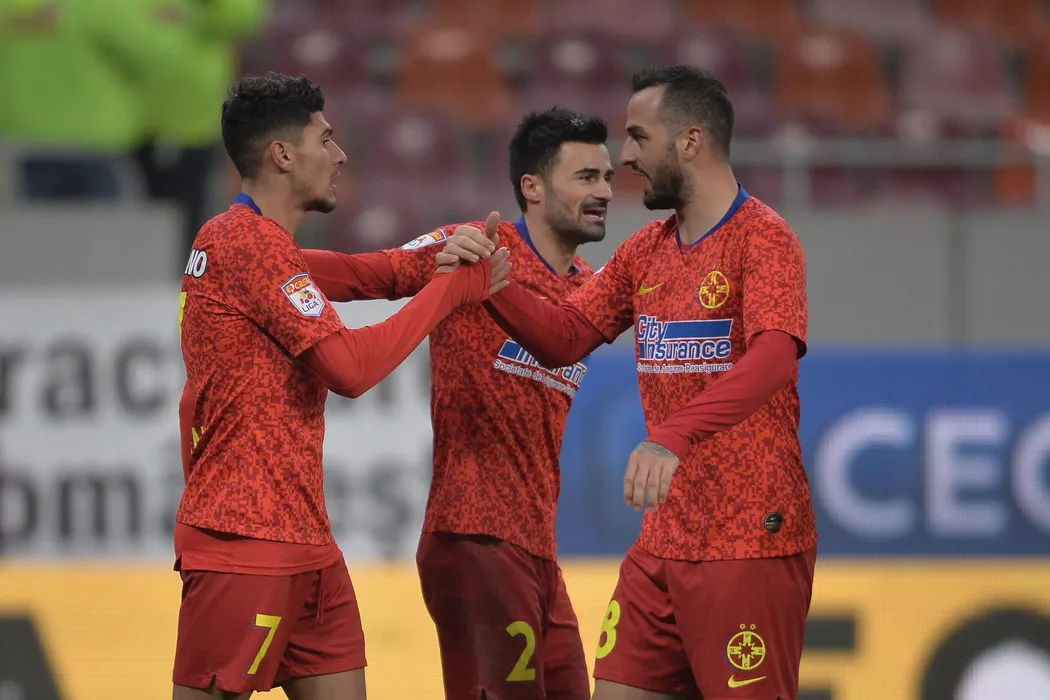 Florinel Coman (S), de la FCSB, este felicitat de coechipierii sai, Valentin Cretu (C) si Aristides Soiledis (D), dupa ce a inscris un gol, in timpul meciului de fotbal contra echipei Gaz Metan Medias din etapa a 20-a a Ligii 1, disputat pe stadionul Arena Nationala din Bucuresti, vineri, 6 decembrie 2019. ALEXANDRU DOBRE / MEDIAFAX FOTO