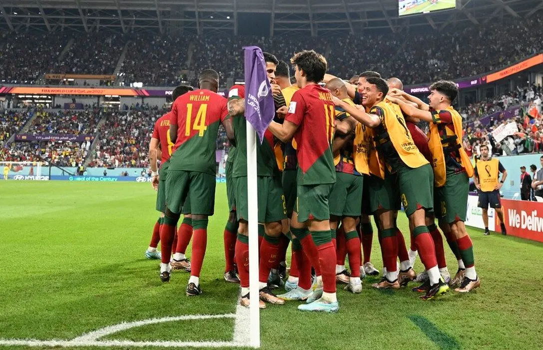 Portugal players celebrate after Portugal's forward #07 Cristiano Ronaldo (not seen) scored their team's first goal from a penalty shot during the Qatar 2022 World Cup Group H football match between Portugal and Ghana at Stadium 974 in Doha on November 24, 2022.,Image: 739948950, License: Rights-managed, Restrictions: , Model Release: no