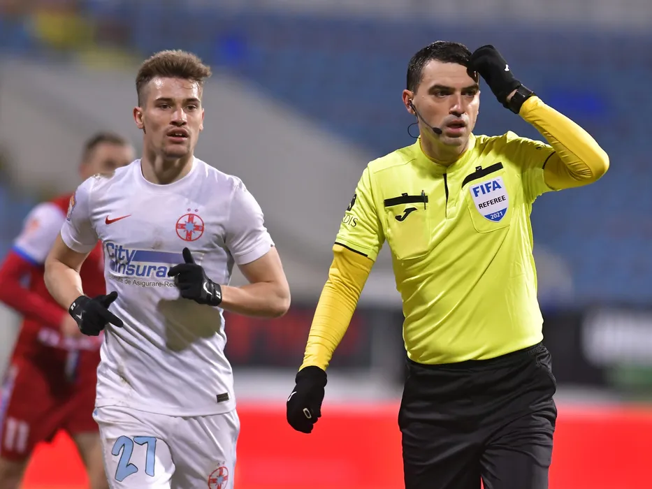 Darius Dumitru Olaru si arbitrul central Ovidiu Hategan in meciul de fotbal dintre FC Botosani si FCSB, contand pentru Liga 1 Casa Pariurilor, desfasurat fara spectatori pe Stadionul Municipal din Botosani, duminica 28 februarie 2021. © FOTO:Razvan Pasarica/SPORT PICTURES