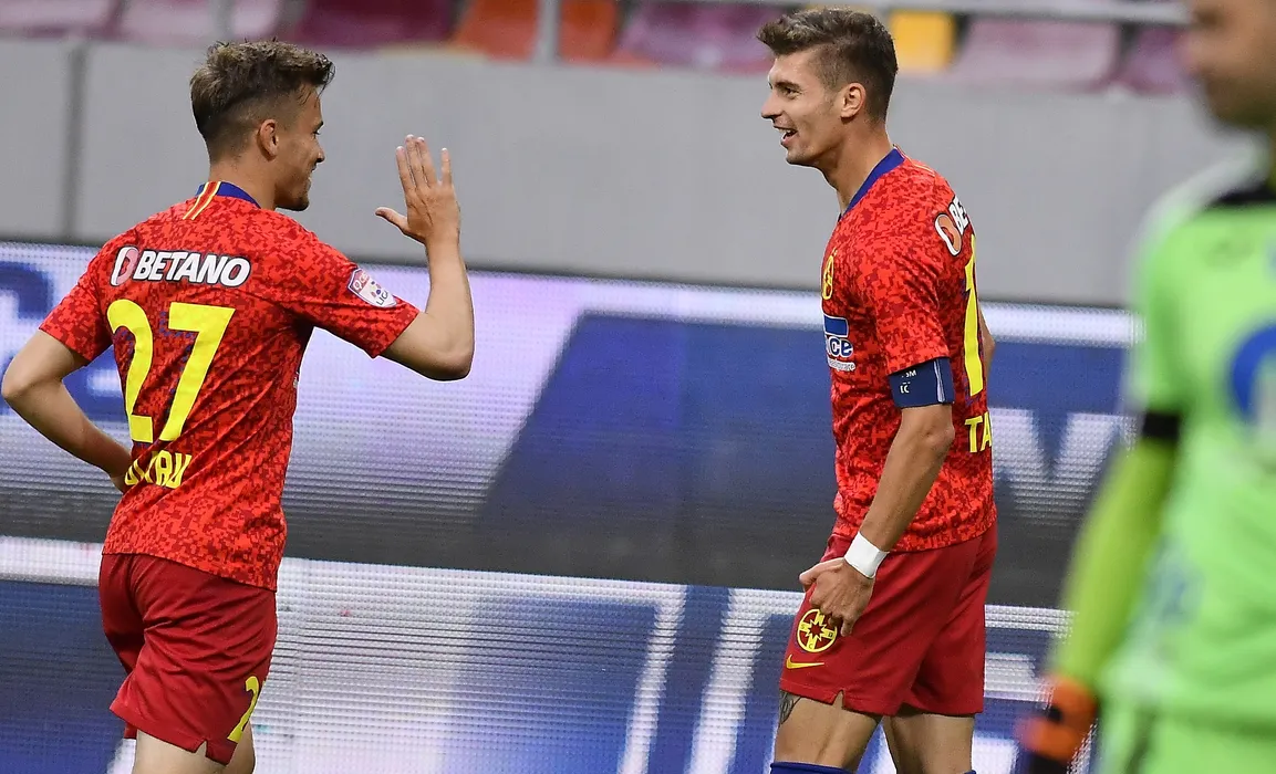 Darius Olaru il felicita pe Florin Tanase dupa golul marcat in meciul de fotbal dintre FCSB si Gaz Metan Medias, contand pentru play-off-ul Ligii 1 Casa Pariurilor, disputat fara spectatori pe Arena Nationala din Bucuresti, duminica 21 iunie 2020. © FOTO:Razvan Pasarica/SPORT PICTURES