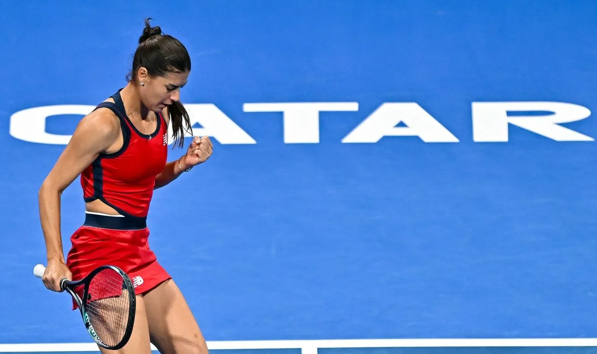 Sorana Cirstea of Romania is reacting during her second-round match against Iga Swiatek of Poland at the WTA 1000-Qatar TotalEnergies Open tennis tournament at the Khalifa International Tennis Complex in Doha, Qatar, on February 12, 2024. Qatar TotalEnergies Open - Day 2, Doha - 13 Feb 2024,Image: 845990063, License: Rights-managed, Restrictions: , Model Release: no