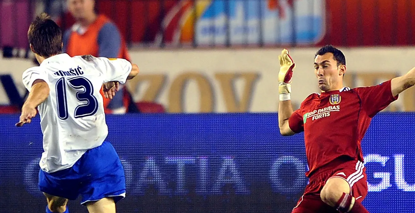 Ante Vukusic of HNK Hajduk (L) scores a goal in front of RSC Anderlecht's goalkeeper Proto Silvio during their UEFA Europa League group G football match in Split, on September 30, 2010. Hajduk won 1-0.,Image: 81433832, License: Rights-managed, Restrictions: , Model Release: no