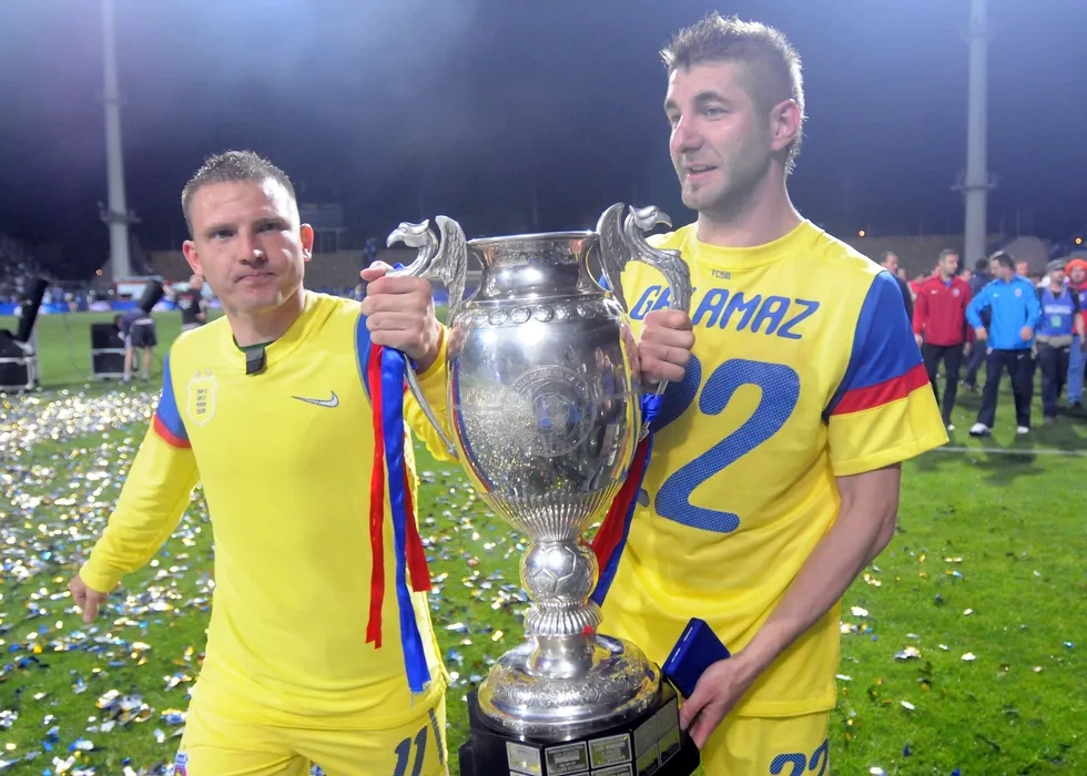 Marius Onofras si George Galamaz se bucura alaturi de trofeul castigat.