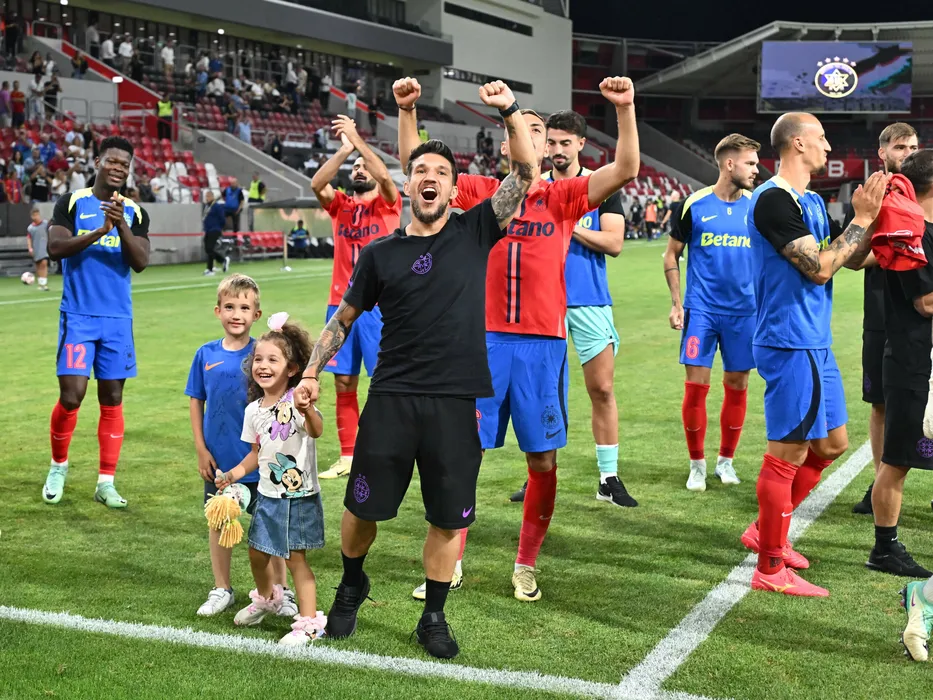 Fotbalistii stelisti Enagnon David Kiki, Alexandru Mihail Baluță, Denis Grațian Haruț si Vlad Iulian Chiricheș saluta galeria dupa meciul dintre Maccabi Tel Aviv FC si FCSB, contand pentru Preliminariile Ligii Campionilor, desfasurat pe Bozsik Arena din Budapesta, miercuri 31 iulie 2024. © FOTO:Razvan Pasarica/SPORT PICTURES