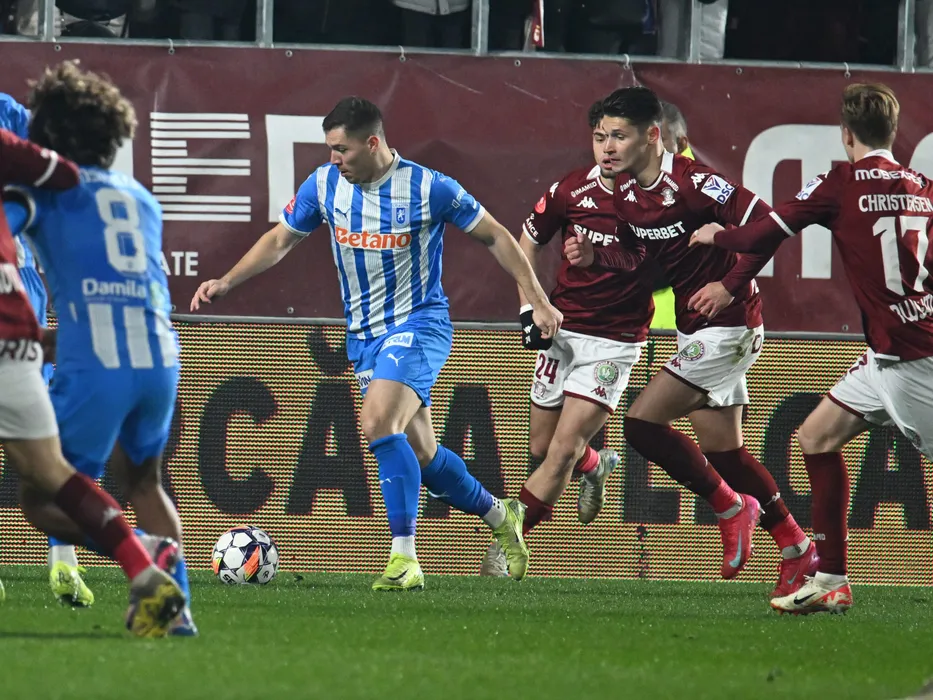 Carlos Andrei Mora Montoya, Sebastian Andrei Borza si Mihai Alexandru Dobre in meciul de fotbal dintre Rapid Bucuresti si Universitatea Craiova, din cadrul Superligii Superbet, desfasurat pe Superbet Arena-Giulesti din Bucuresti, sambata 25 ianuarie 2025. © FOTO:Razvan Pasarica/SPORT PICTURES