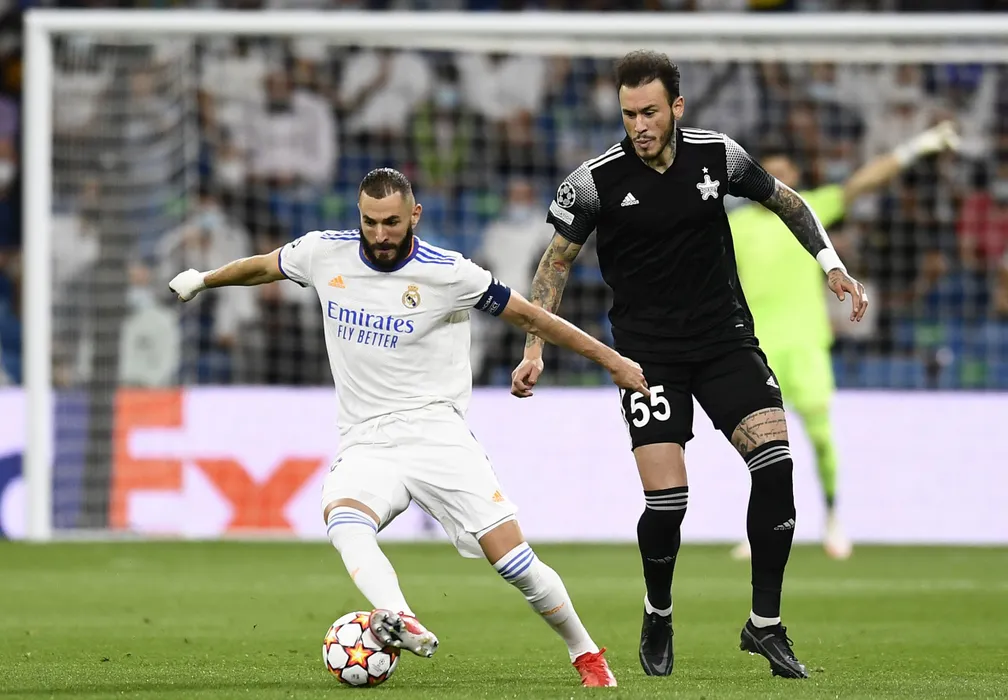 Real Madrid's Karim Benzema, left, duels for the ball with Sheriff's Gustavo Dulanto during the Champions League group D soccer match between Real Madrid and Sheriff, Tiraspol at the Bernabeu stadium in Madrid, Spain, Tuesday, Sept. 28, 2021. (AP Photo/Jose Breton)
