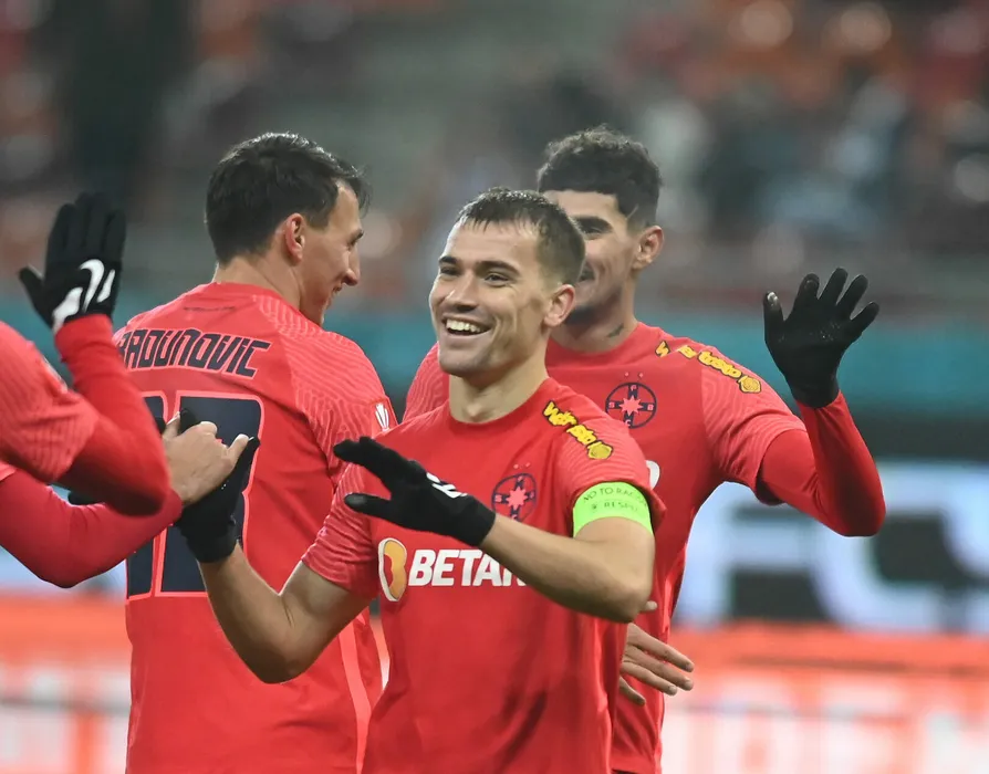 Darius Dumitru Olaru il felicita pe Eduard Gabriel Radaslavescu dupa un gol marcat in meciul de fotbal dintre FCSB si CS Mioveni, contand pentru Superliga Superbet, desfasurat pe Arena Nationala din Bucuresti, luni 5 decembrie 2022. © FOTO:Razvan Pasarica/SPORT PICTURES