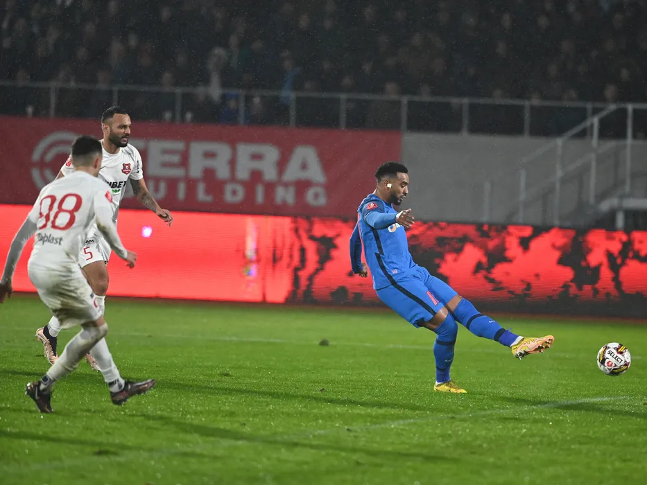 Abdel Slem Billel Omrani marcheaza un gol de langa Florin Bejan in meciul de fotbal dintre FC Hermannstadt si FCSB, contand pentru Superliga Superbet, desfasurat pe Stadionul Municipal din Sibiu, duminica 22 ianuarie 2023. © FOTO:Razvan Pasarica/SPORT PICTURES