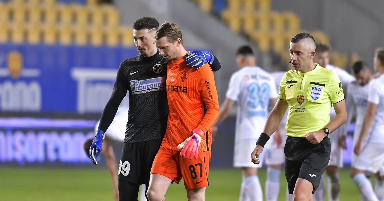 Arbitrul central Radu Petrescu alaturi de portarii Andrei Daniel Vlad si Giedrius Arlauskis in meciul de fotbal dintre CFR Cluj si FCSB, Supercupa Romaniei, desfasurat fara spectatori pe Stadionul Ilie Oana din Ploiesti, joi 15 aprilie 2021. © FOTO:Razvan Pasarica/SPORT PICTURES