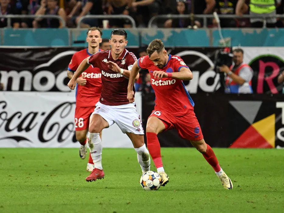 Timotej Jambor si Mihai Daniel Lixandru in meciul de fotbal dintre Rapid Bucuresti si FCSB, din cadrul Superligii Superbet, desfasurat pe Arena Nationala din Bucuresti, duminica 17 august 2025. © FOTO:Razvan Pasarica/SPORT PICTURES