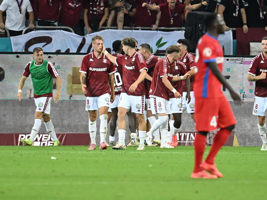 Bucurie a fotbalistilor rapidisti Timotej Jambor, Sebastian Andrei Borza si Constantin Grameni dupa un gol marcat alături de galerie in meciul de fotbal dintre Rapid Bucuresti si FCSB, din cadrul Superligii Superbet, desfasurat pe Arena Nationala din Bucuresti, duminica 17 august 2025. © FOTO:Razvan Pasarica/SPORT PICTURES