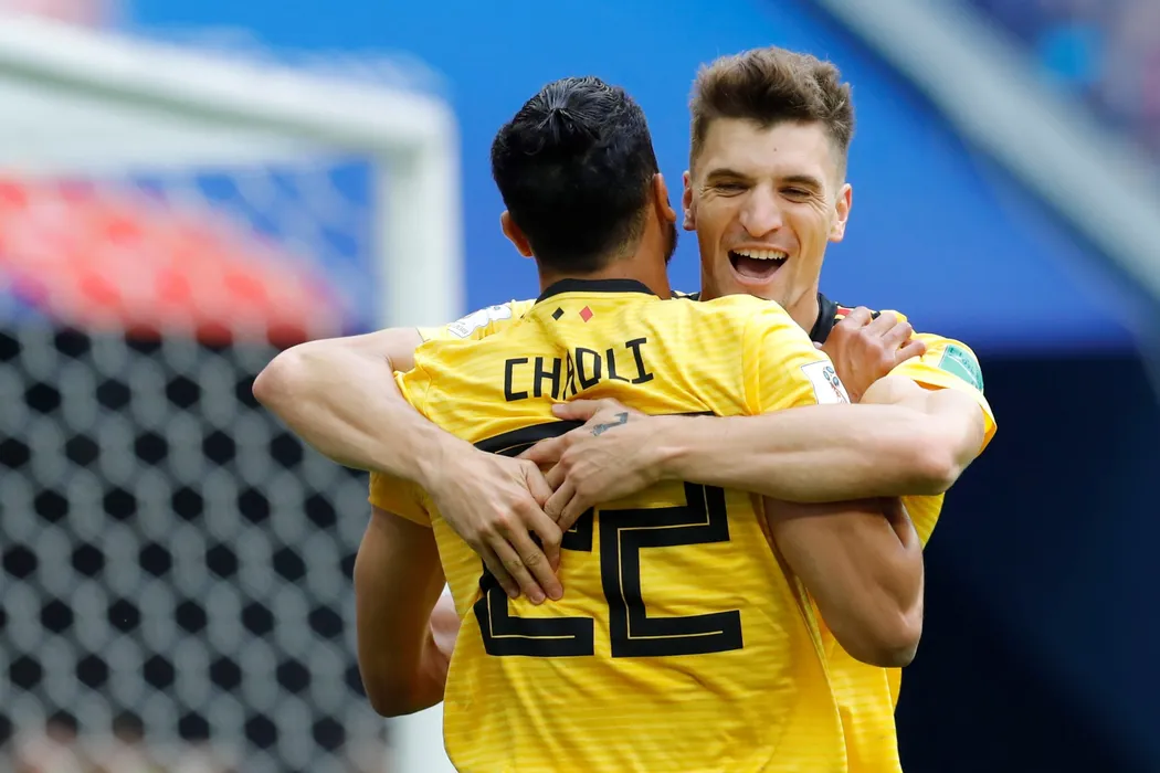 SAINT PETERSBURG, RUSSIA - JULY 14 : Thomas Meunier (15) of Belgium celebrates with his teammate Nacer Chadli (22) after scoring a goal during the 2018 FIFA World Cup Russia Play-Off for Third Place between Belgium and England at the Saint Petersburg Stadium in Saint Petersburg, Russia on July 14, 2018. Fatih Aktas / Anadolu Agency/ Hepta / Sport Pictures