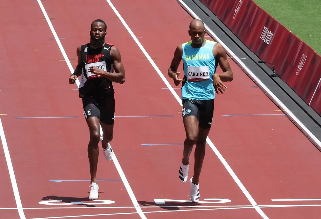 Bahamas's Steven Gardiner crosses the finish line to win ahead of second-placed Trinidad and Tobago's Deon Lendore in the men's 400m heats during the Tokyo 2020 Olympic Games at the Olympic Stadium in Tokyo on August 1, 2021.,Image: 624622601, License: Rights-managed, Restrictions: , Model Release: no, Credit line: Profimedia