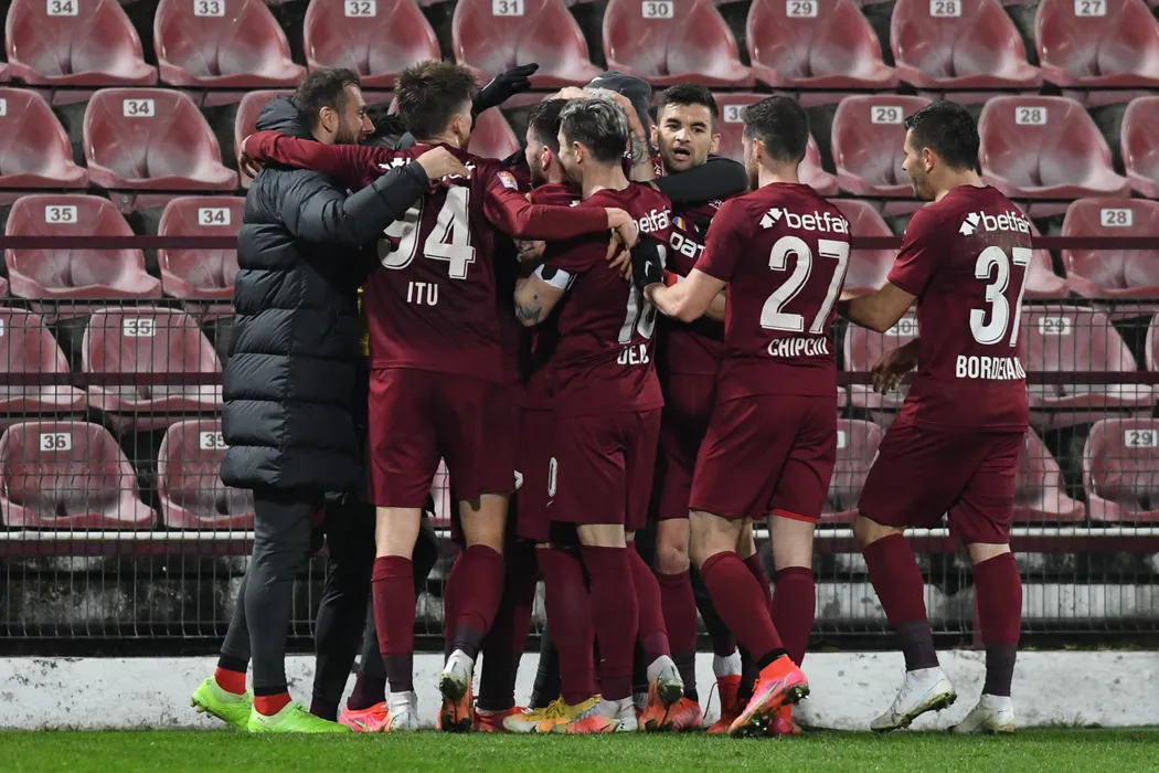 Jucatorii formatiei CFR Cluj reactioneaza dupa ce au inscris un gol in timpul meciului de fotbal contra echipei CSM Politehnica Iasi din etapa a XXVII-a a Ligii 1, disputat pe stadionul Dr. Constantin Radulescu din Cluj-Napoca, duminica, 14 martie 2021. FLAVIU BUBOI / MEDIAFAX FOTO