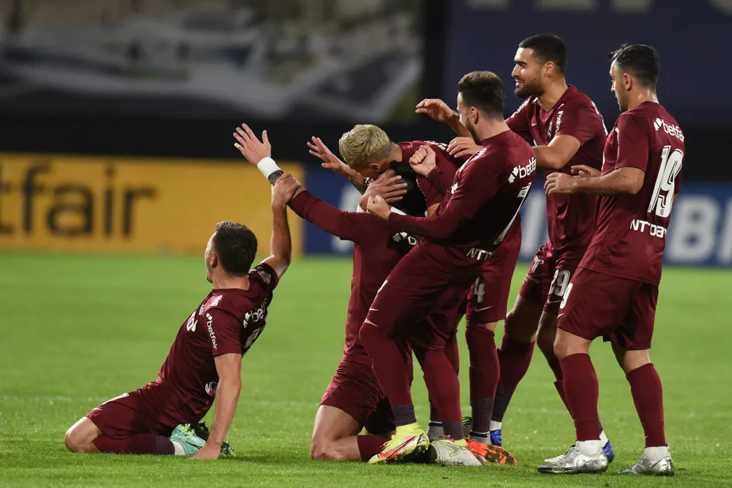 Jucatorii formatiei CFR Cluj reactioneaza dupa inscrierea unui gol in timpul meciului de fotbal contra echipei CS Universitatea Craiova din etapa a IX - a a Ligii 1, disputat pe stadionul Dr. Constantin Radulescu, luni, 20 septembrie 2021 DAN HORIA TAUTAN / MEDIAFAX FOTO