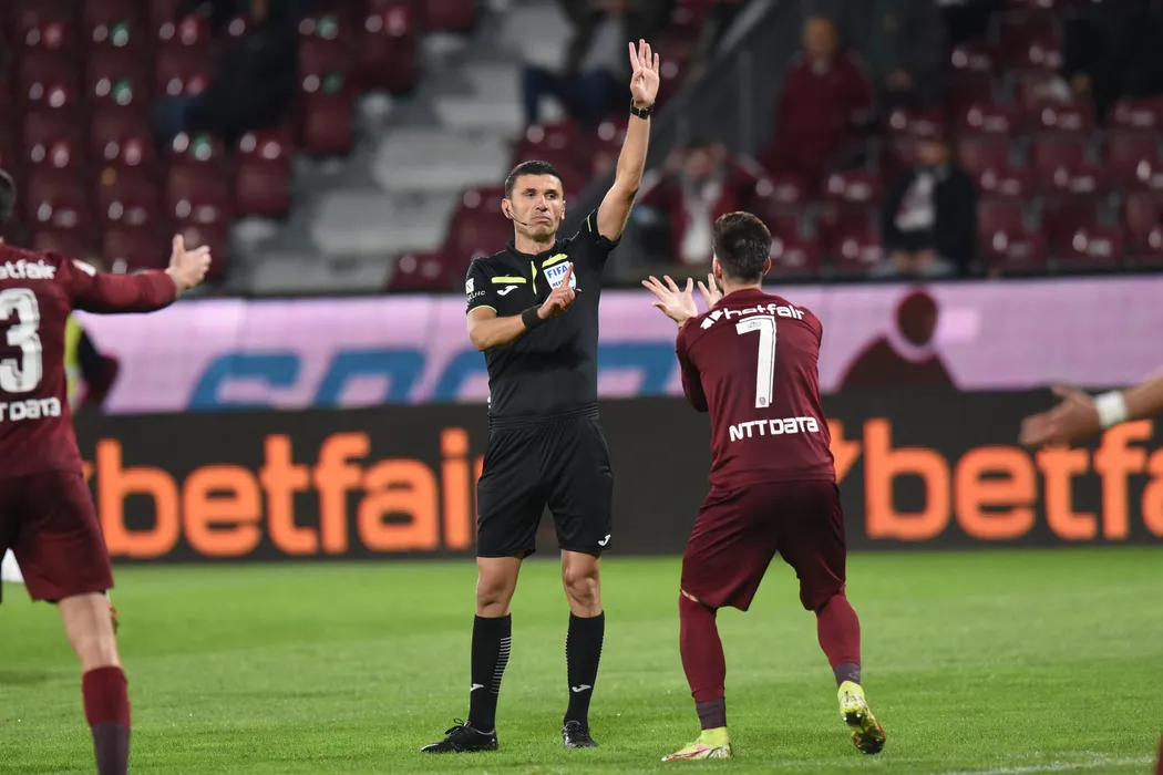 Arbitrul Marcel Birsan conduce meciul de fotbal dintre echipele CFR Cluj si CS Universitatea Craiova din etapa a IX - a a Ligii 1, disputat pe stadionul Dr. Constantin Radulescu, luni, 20 septembrie 2021. DAN HORIA TAUTAN / MEDIAFAX FOTO