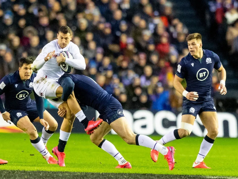 8th February 2020; Murrayfield Sadium, Edinburgh, Scotland; International Six Nations Rugby, Scotland versus England; Blair Kinghorn of Scotland tackles Jonny May of England Scotland v England, Guinness Six Nations, Rugby Union, Murrayfield Stadium, Edinburgh, Scotland, UK - 08 Feb 2020, Image: 497207291, License: Rights-managed, Restrictions: Editorial Use Only, Model Release: no, Credit line: Alan Rennie/Action Plus / Shutterstock Editorial / Profimedia