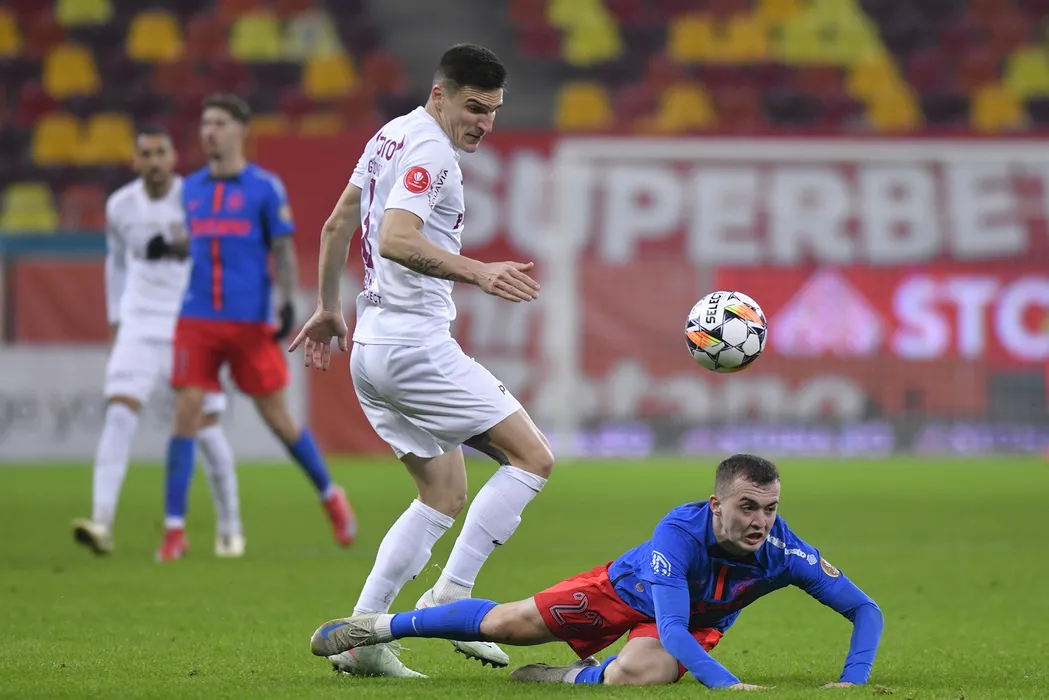 Mihai Vladut Toma (jos), de la FCSB, lupta pentru balon cu Daniel Graovac (sus), de la CFR Cluj, in timpul meciului de fotbal din etapa 24 a Superligii, disputat pe stadionul Steaua din Bucuresti, duminica, 2 februarie 2025. ALEXANDRU DOBRE / MEDIAFAX FOTO