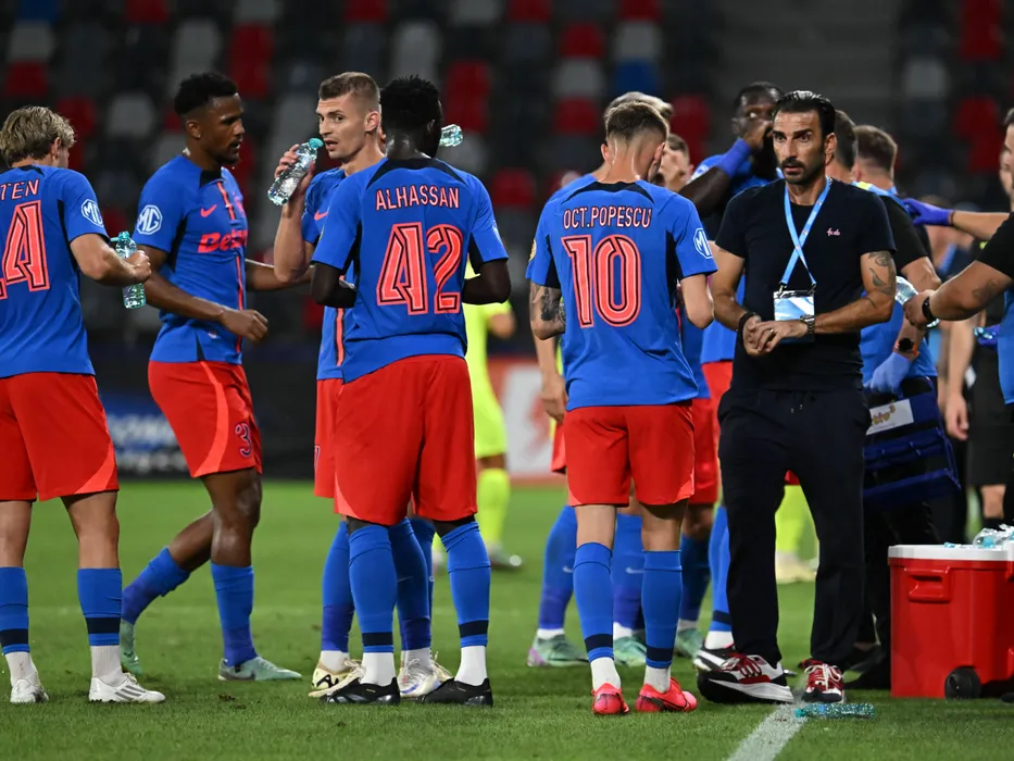 Florin Lucian Tanase discută cu William Guido R Baeten alături de Octavian George Popescu si Elias Charalambous la o pauza de hidratare luata in meciul dintre FCSB si Politehnica Iasi, contand pentru Superliga Superbet, desfasurat pe Stadionul Steaua-Ghencea din Bucuresti, sambata 17 august 2024. © FOTO:Razvan Pasarica/SPORT PICTURES