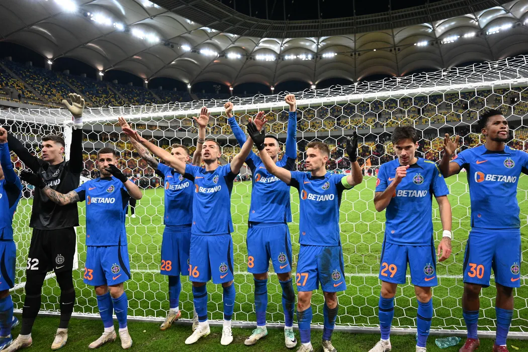 Fotbalistii stelisti Stefan Tarnovanu, Ovidiu Marian Popescu, Grigoras Alexandru Pantea, Mihai Daniel Lixandru,Adrian Gheorghe Sut, Darius Dumitru Olaru, Dorin Rotariu si Siyabonga Ngezana saluta galeria dupa meciul de fotbal dintre Dinamo Bucuresti si FCSB, din cadrul Superligii Superbet, desfasurat pe Arena Nationala din Bucuresti, duminica 26 noiembrie 2023. © FOTO:Razvan Pasarica/SPORT PICTURES