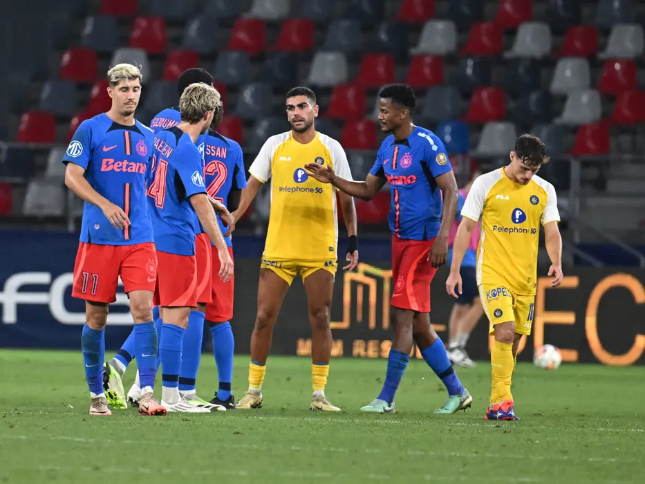 Fotbalistii stelisti David Raul Miculescu si Siyabonga Ngezana isi saluta adversarii Raz Shlomo si Gavriel Kanichowsky dupa meciul dintre FCSB si Maccabi Tel Aviv FC, contand pentru Preliminariile Ligii Campionilor, desfasurat pe Stadionul Steaua-Ghencea din Bucuresti, marti 23 iulie 2024. © FOTO:Razvan Pasarica/SPORT PICTURES