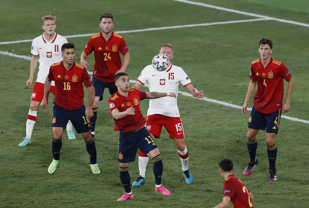 Poland's Kamil Glik, center, and Spain's Ferran Torres challenge for the ball during the Euro 2020 soccer championship group E match between Spain and Poland at Estadio de la Cartuja stadium in Sevilla, Spain, Saturday, June 19, 2021. (Jose Manuel Vidal/Pool via AP)