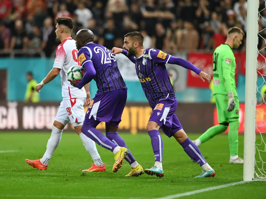 Fotbalistii argeseni Kevin Brandon Xavier Koubemba si Alin Dobrosavlevici se bucura dupa un gol marcat in meciul de fotbal dintre Dinamo Bucuresti si FC Arges, contand pentru mansa tur a barajului de promovare in Superliga Superbet, desfasurat pe Arena Nationala din Bucuresti, luni 29 mai 2023. © FOTO:Razvan Pasarica/SPORT PICTURES
