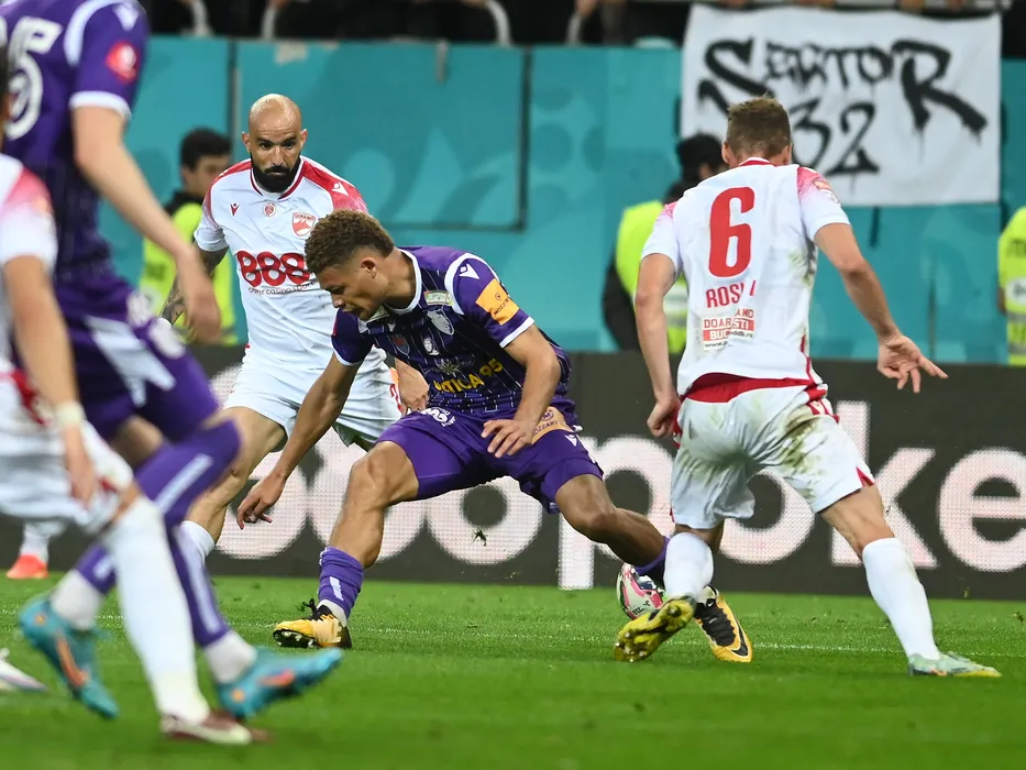 Gabriel Rodrigues De Moura si Zorhan Ludovic Bassong in meciul de fotbal dintre Dinamo Bucuresti si FC Arges, contand pentru mansa tur a barajului de promovare in Superliga Superbet, desfasurat pe Arena Nationala din Bucuresti, luni 29 mai 2023. © FOTO:Razvan Pasarica/SPORT PICTURES