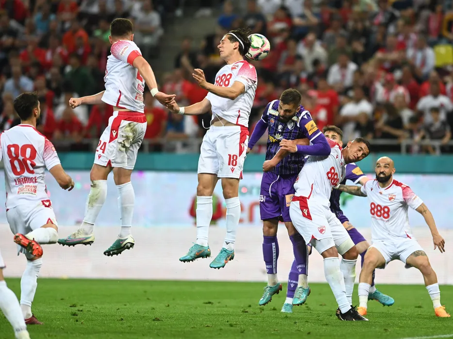 Valentin Ioan Borcea, Alin Dobrosavlevici, Quentin Alexandre Bena si Gabriel Rodrigues De Moura in meciul de fotbal dintre Dinamo Bucuresti si FC Arges, contand pentru mansa tur a barajului de promovare in Superliga Superbet, desfasurat pe Arena Nationala din Bucuresti, luni 29 mai 2023. © FOTO:Razvan Pasarica/SPORT PICTURES