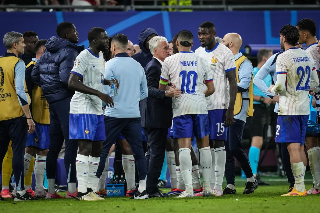 Didier Deschamps (C), head coach of France, instructs Kylian Mbappe before the extra time during the UEFA Euro 2024 quarter-final match between Portugal and France in Hamburg, Germany on July 5, 2024. Photo by Pan Yulong/Xinhua/ABACAPRESS.COM