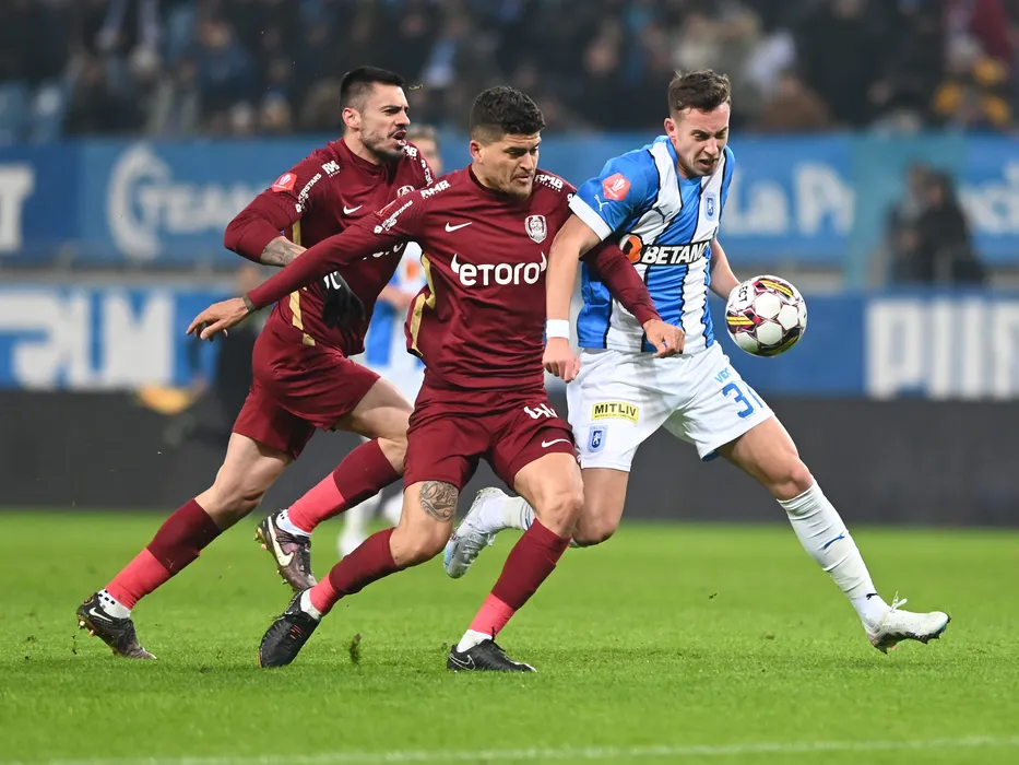 Andonie Andrei Burca, Mihai Alexandru Isfan si Jefferson Yuri De Sousa Matias in meciul de fotbal dintre Universitatea Craiova si CFR Cluj, contand pentru Superliga Superbet, desfasurat pe Stadionul Ion Oblemenco din Craiova, sambata 11 februarie 2023. © FOTO:Razvan Pasarica/SPORT PICTURES