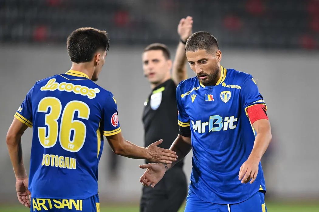 Gheorghe Teodor Grozav si Alin Marius Botogan in meciul de fotbal dintre FC Universitatea Cluj si Petrolul Ploiesti, contand pentru Superliga Superbet, desfasurat pe Stadionul Municipal din Sibiu, sambata 9 august 2025. © FOTO:Flaviu Buboi/SPORT PICTURES