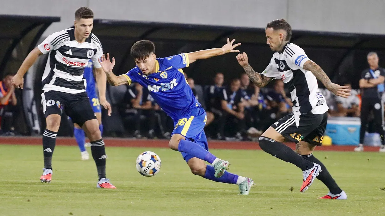 Alin Marius Botogan si Alessandro Murgia, Gabriel Bogdan Simion in meciul de fotbal dintre FC Universitatea Cluj si Petrolul Ploiesti, contand pentru Superliga Superbet, desfasurat pe Stadionul Municipal din Sibiu, sambata 9 august 2025. © FOTO:Valentin Macrea/SPORT PICTURES